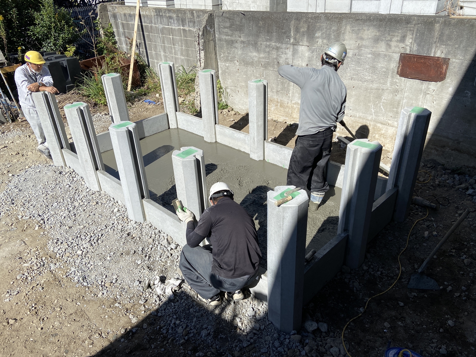 ミヤコWG(ウォーターガード)Ⓡ止水実験施工 5日目 柵板どうしが重なる箇所にプライマーを塗布 柵板どうしが重なる箇所にあらかじめプライマーを塗布しておく。 STEP1 土間コンクリートを流し込み 止水実験の為、土間コンクリートを流し込みます。 STEP2 土間コンクリートならし → 養生 止水実験の為、土間コンクリートを流し込み、ならします。 そして、テントを掛けて養生。 STEP3